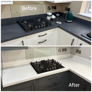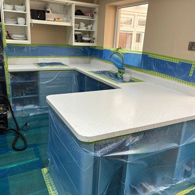 Spray granite uses granite particles in a water-based resin that is applied using a specially engineered spray gun, resulting in a seamless finish that brings timeless beauty to your kitchen, bathroom, or any setting within your home. We prepare your space by protecting all surrounding areas, and prep the surface for the four-step coating system. This includes a poly-rapid primer base coat in your chosen colour, then the natural granite effect is applied, followed by the Diamond Coat antibacterial sealant . Each stage is sanded to achieve the desired texture, whether smooth or textured.